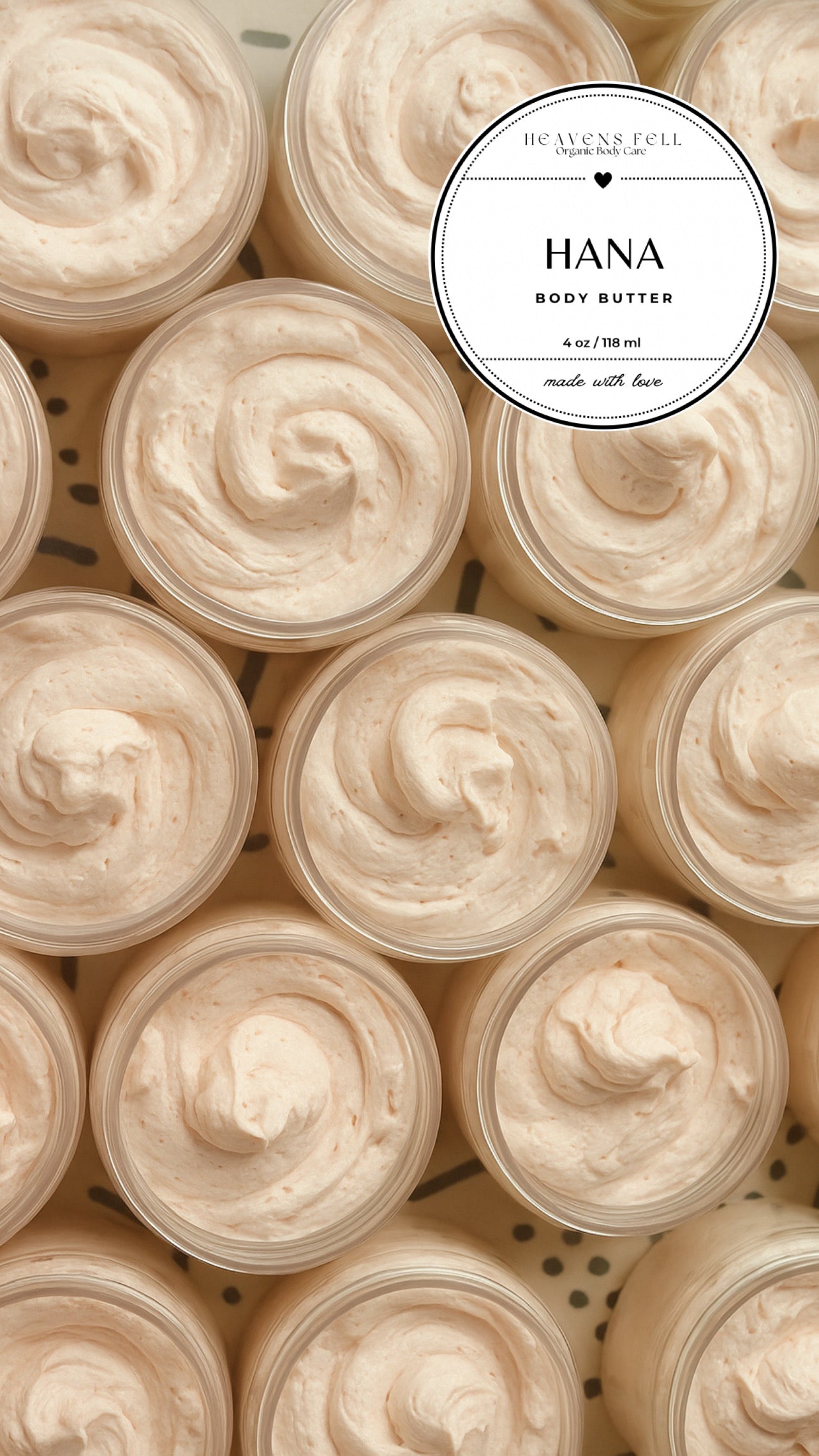 Wrap your skin in the rich, restorative care of Hana Body Butter. Crafted with a blend of deeply nourishing plant butters and natural oils, this luxurious formula melts into the skin to deliver lasting hydration, improve texture, and restore your natural radiance.