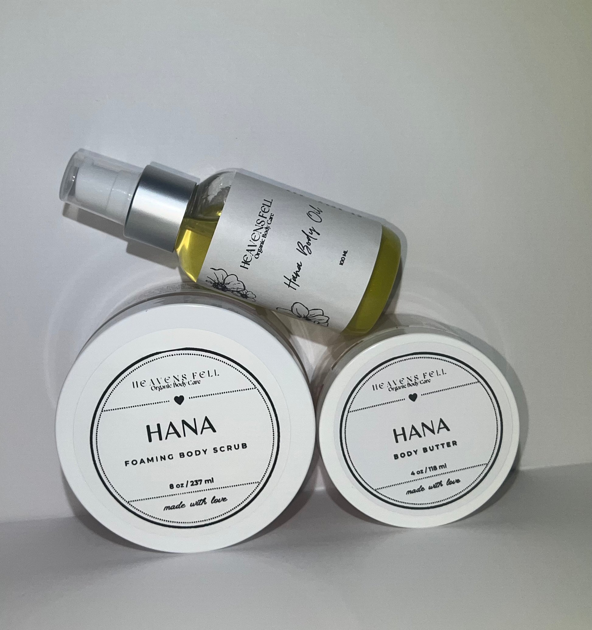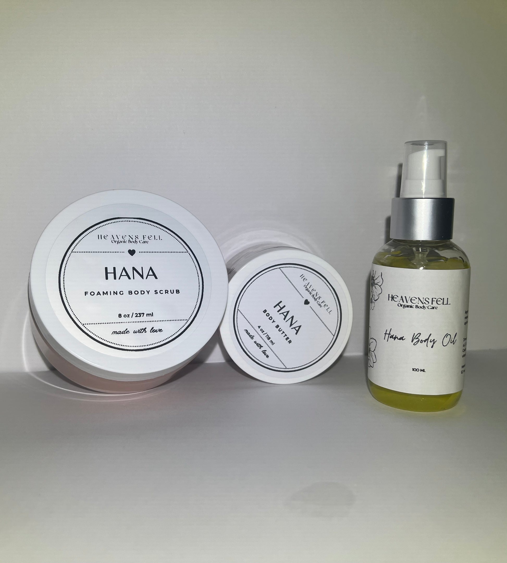 Indulge your senses with the Hana Combo, a luxurious self-care trio inspired by the timeless beauty of Japanese Cherry Blossom. This elegant set includes a nourishing Body Oil, a rich Body Butter, and an exfoliating Body Scrub—each infused with the delicate, floral-fruity aroma of blooming sakura petals.